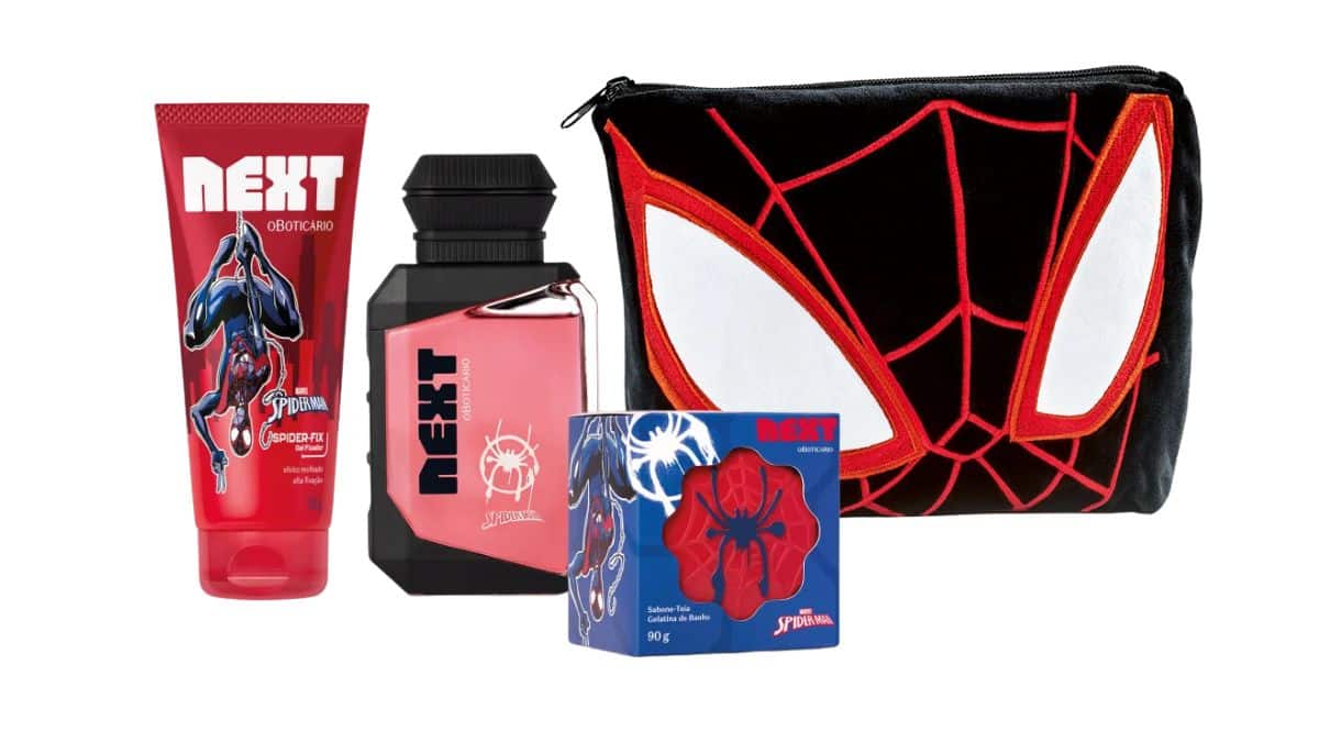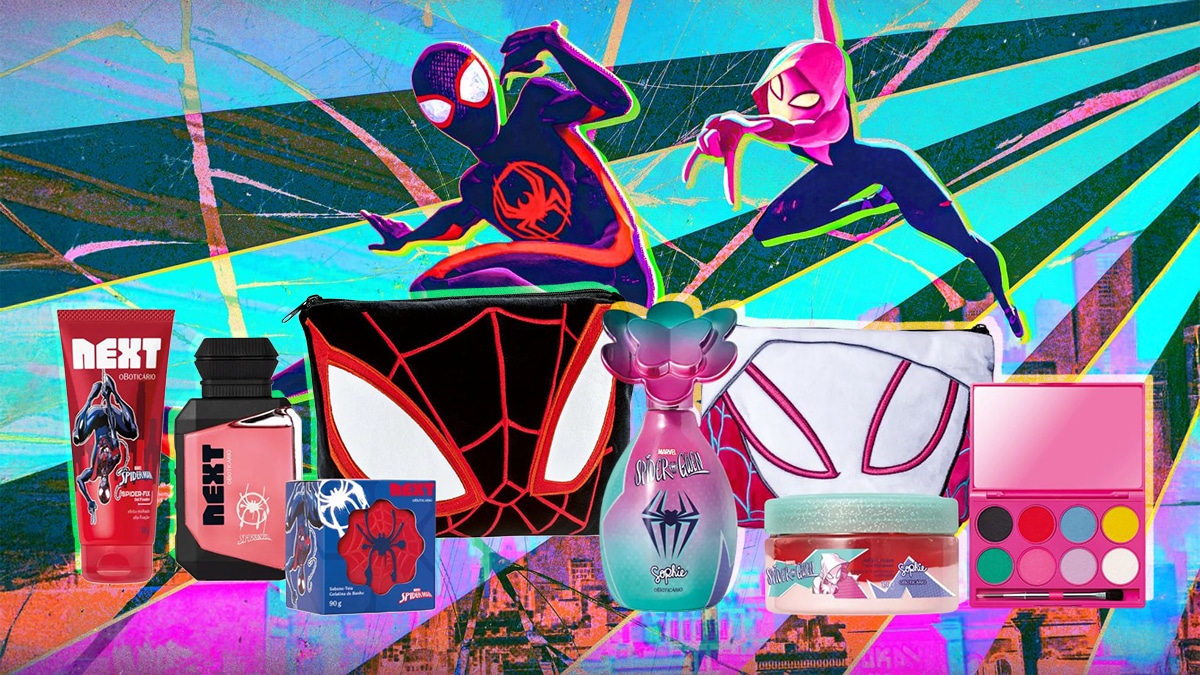 Lançamento da linha Spider-Man do Boticário, incluindo produtos como colônia e nécessaire temática dos personagens Spider-Gwen e Miles Morales.