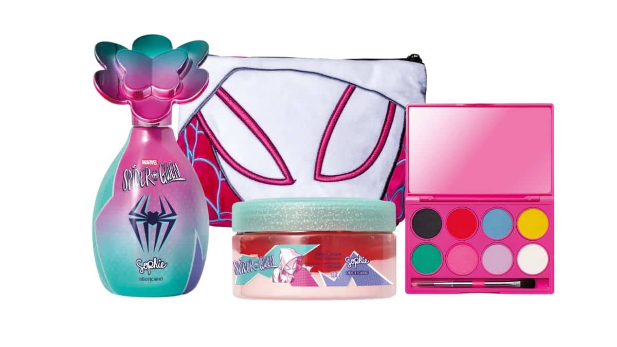 Linha de produtos da linha Spider-Gwen, incluindo colônia, jelly cream, paleta de tintas e nécessaire temática.